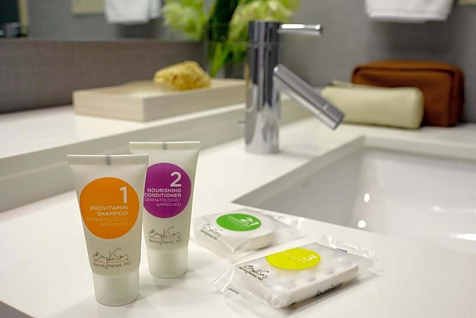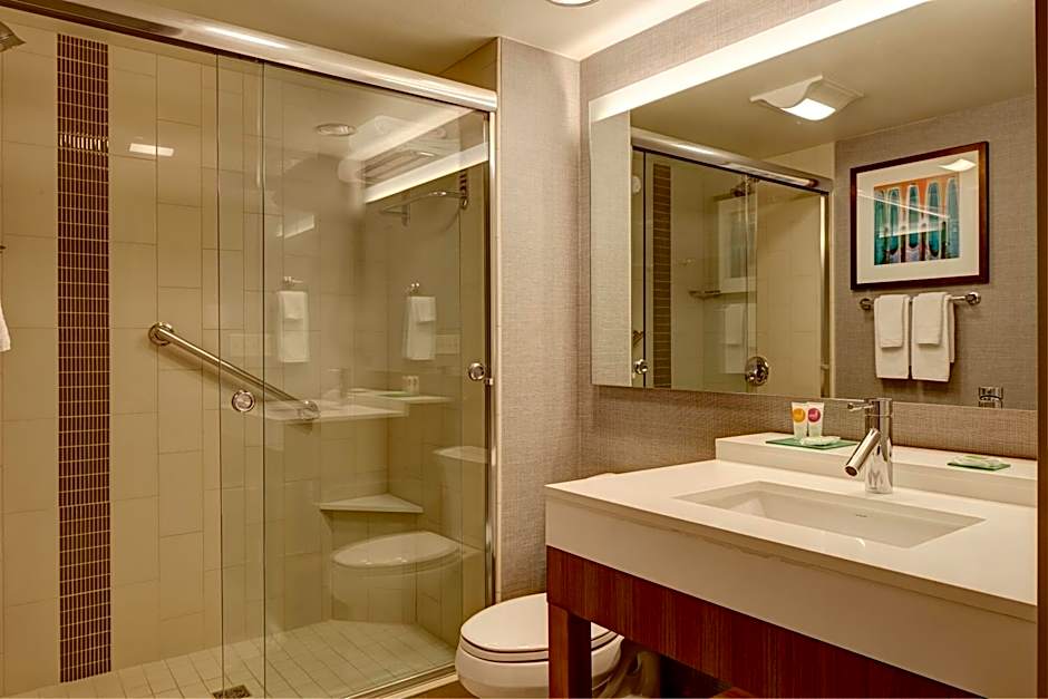 This room offers a roll-in shower or tub with closed-caption TV, wider doors, and a lower-level entryway.